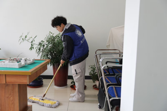 以行动践初心,用温情暖夕阳。在养老服务中心,志愿者们分工明确,在相关工作人员的带领下,进行了扫地、擦桌、收拾娱乐活动室等基础清扫工作,为老人们营造了一个干净舒适的环境。之后的表演环节中,志愿者们诚意满满、笑容洋溢地带来了手势舞表演,并耐心地为老人们进行手势舞教学,最后为他们分发了水杯、毛巾等礼物。志愿者们的清扫工作让老人们的居住环境变得更加干净舒适,精彩的表演也为养老院注入了活力,这让敬老爱老不止停留在言语,更落实在行动。
